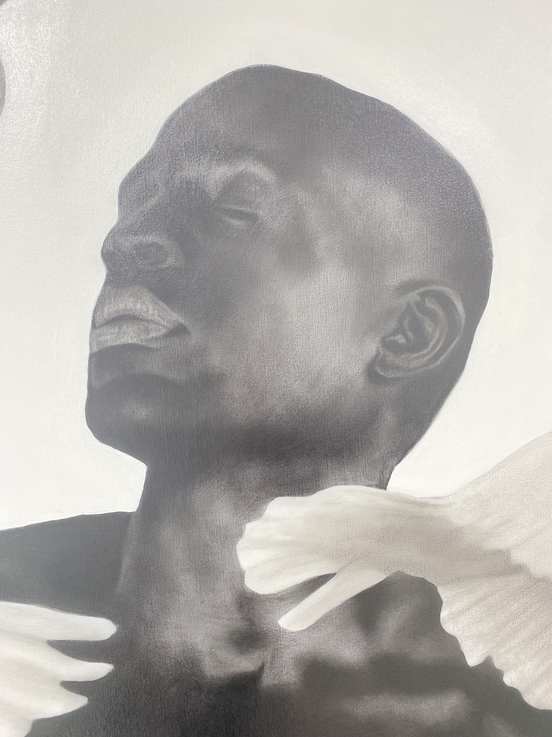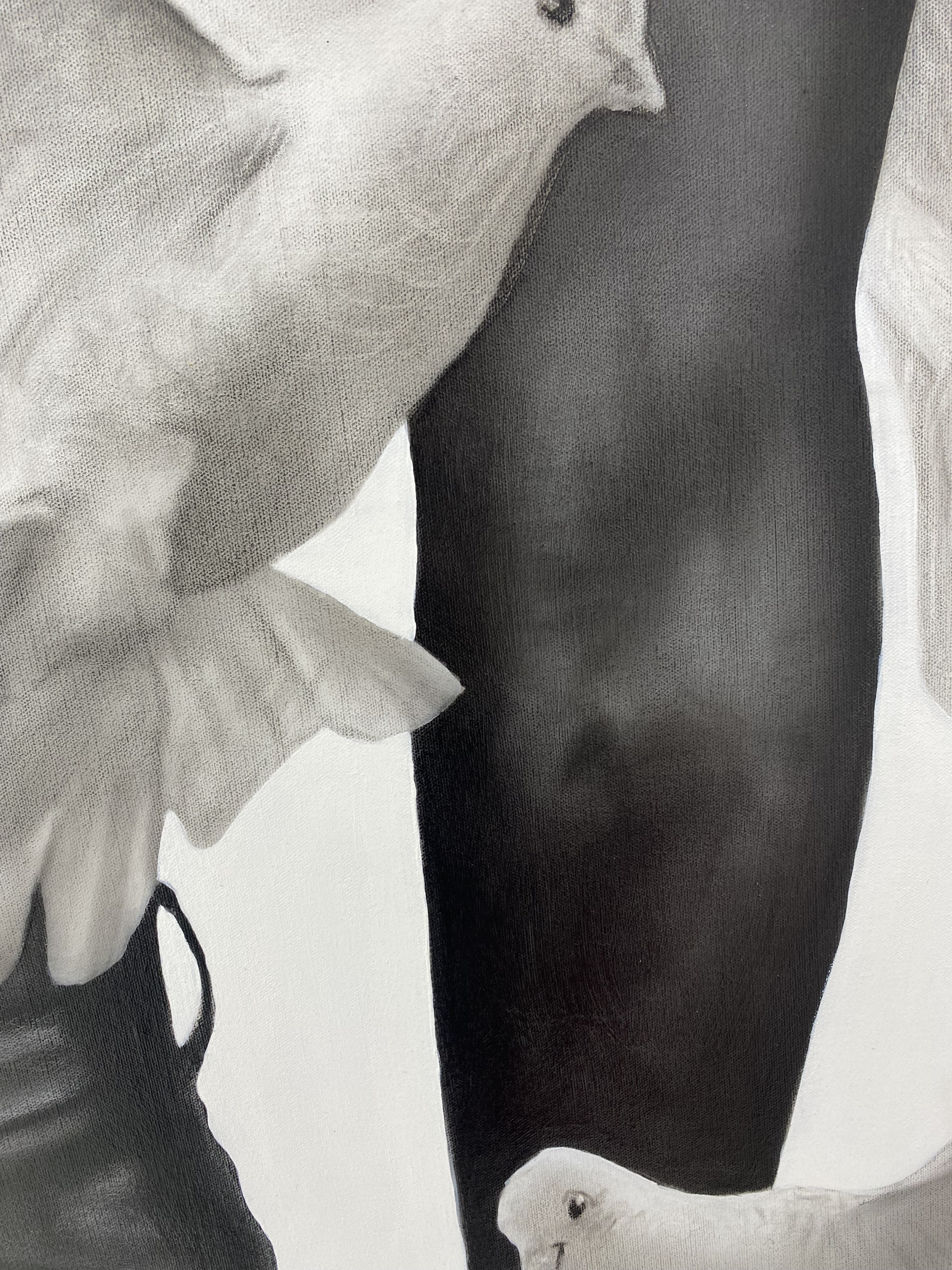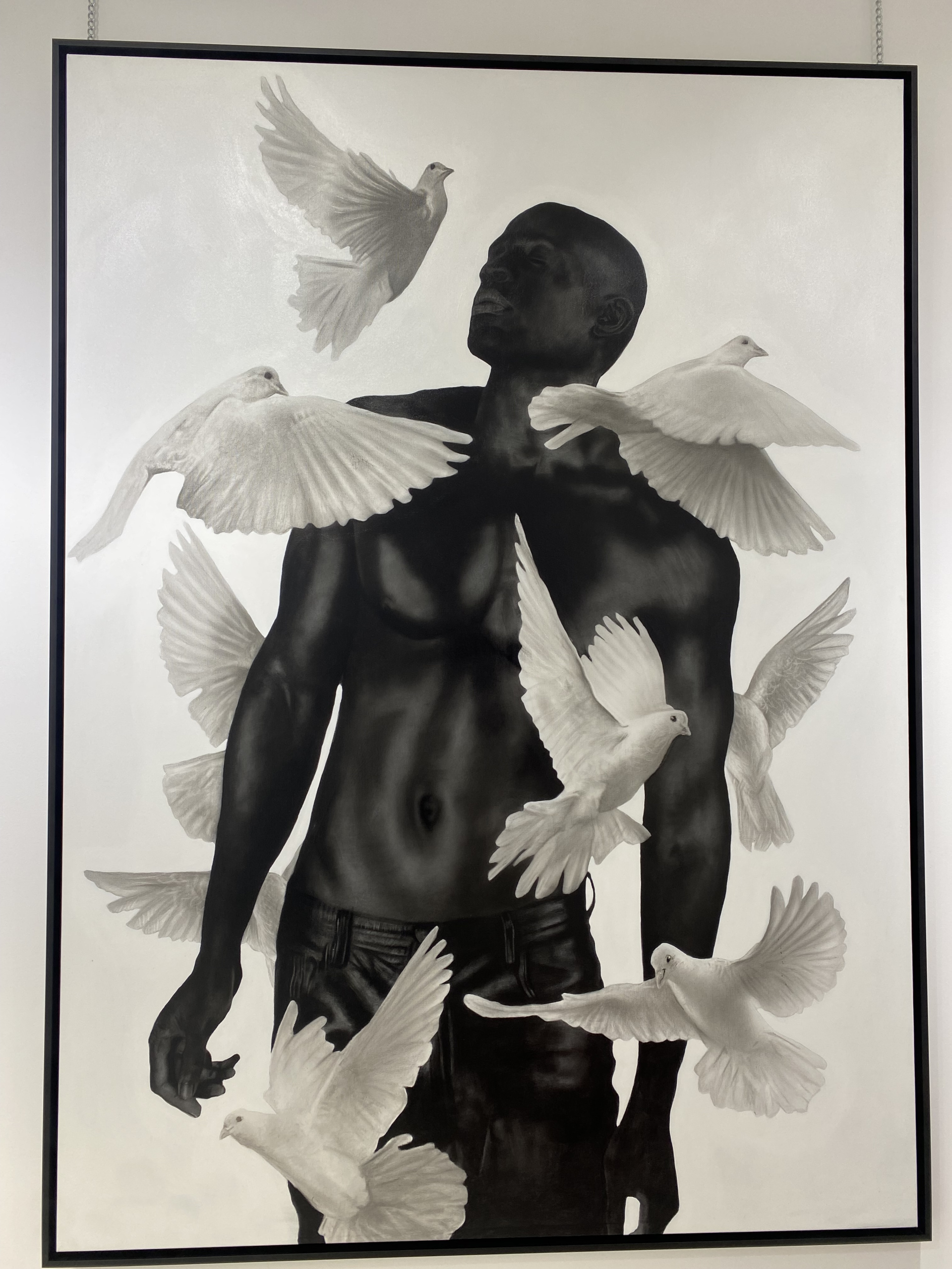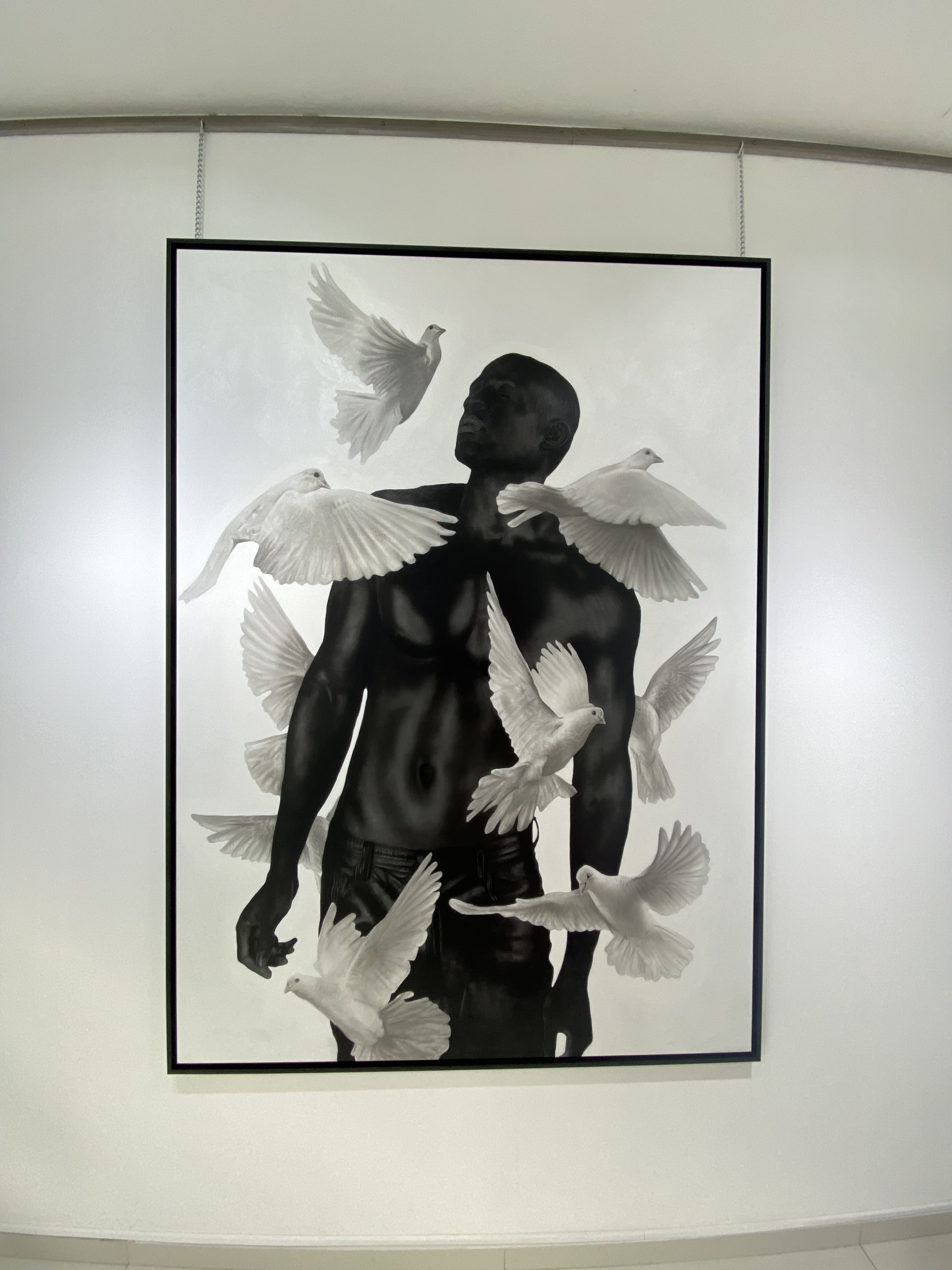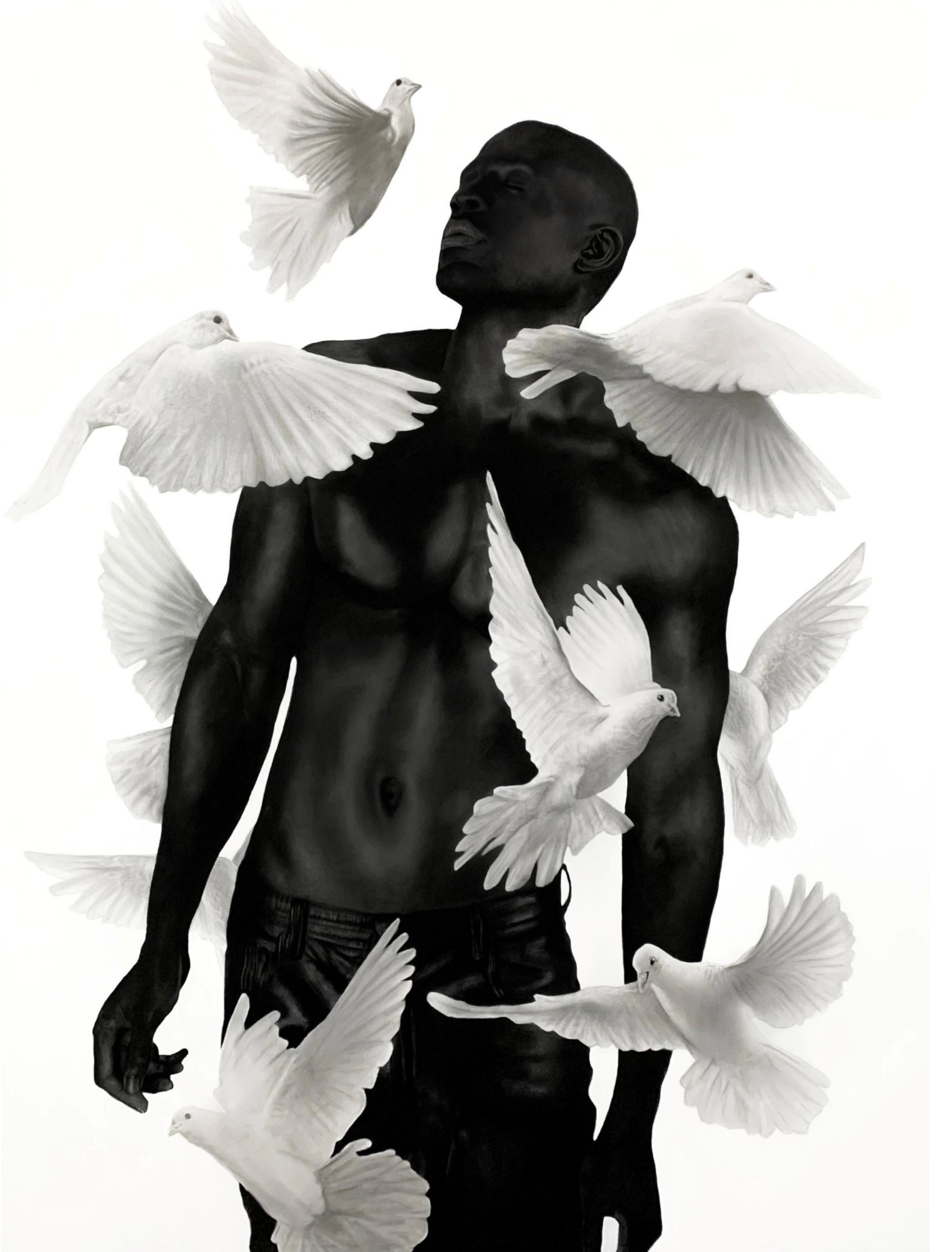 À volta da figura central estão várias pombas em voo, com as asas estendidas enquanto navegam graciosamente no espaço à sua volta. No léxico artístico de Oliveira, as aves simbolizam fragilidades, e a presença destas pombas serve para sublinhar o tema da vulnerabilidade inerente à experiência humana. A sua presença etérea acrescenta profundidade à composição, sugerindo o delicado equilíbrio entre força e vulnerabilidade que define a condição humana.
