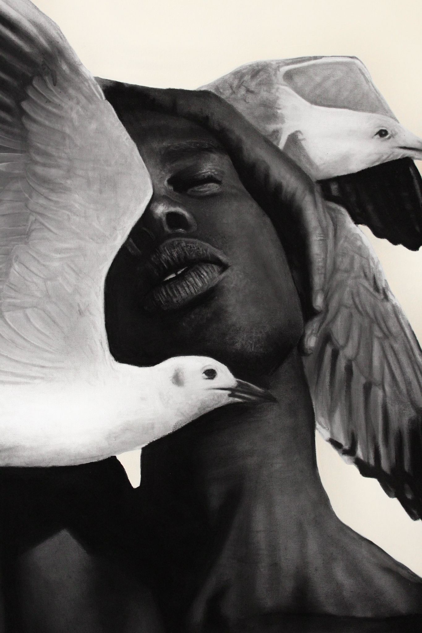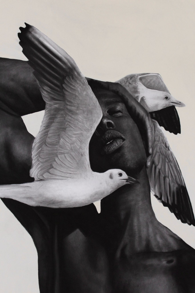 • Oliveira’s mastery of charcoal gives the portrait a sculptural depth, while the delicate acrylic rendering of the birds enhances the illusion of weightlessness.