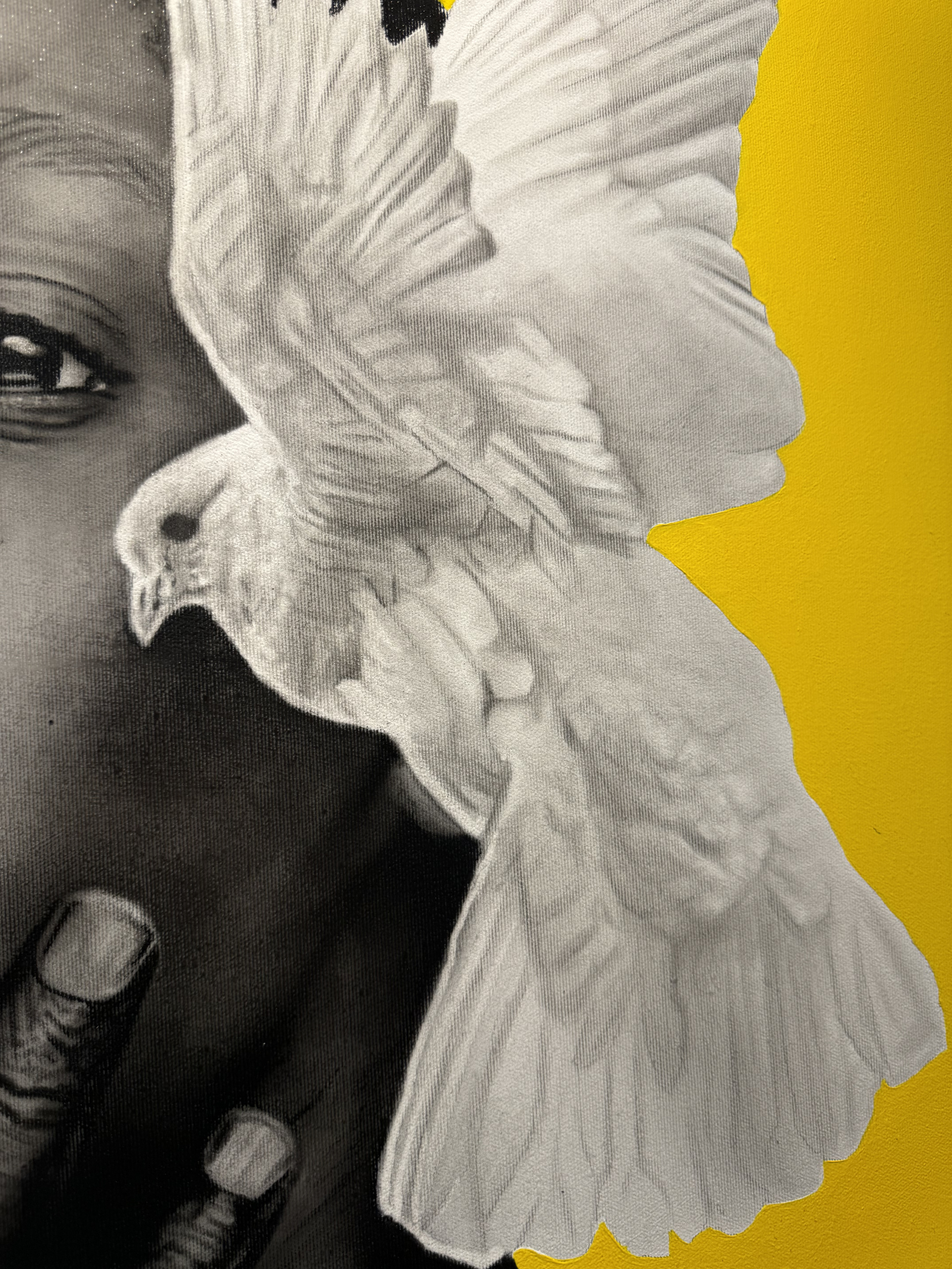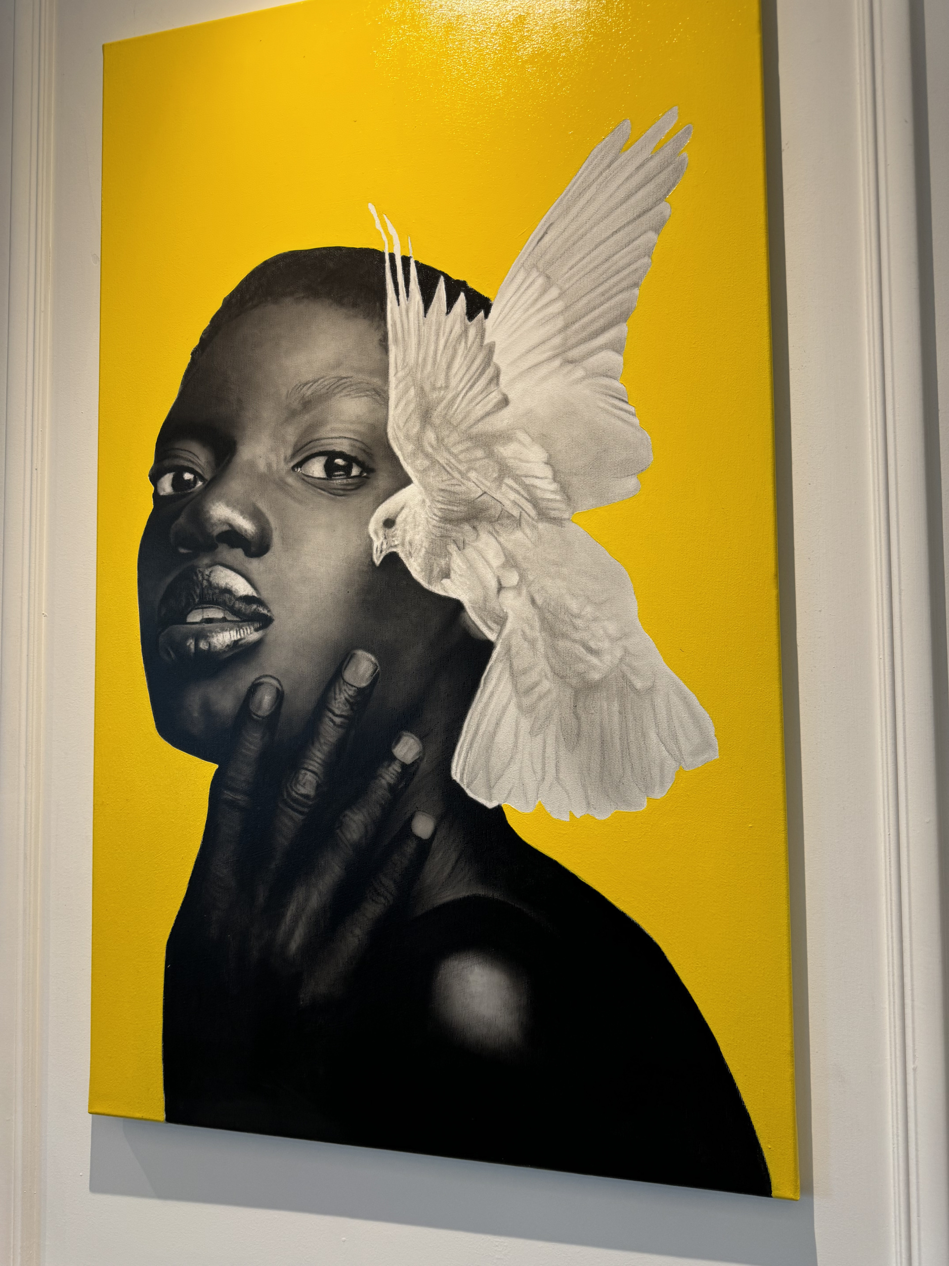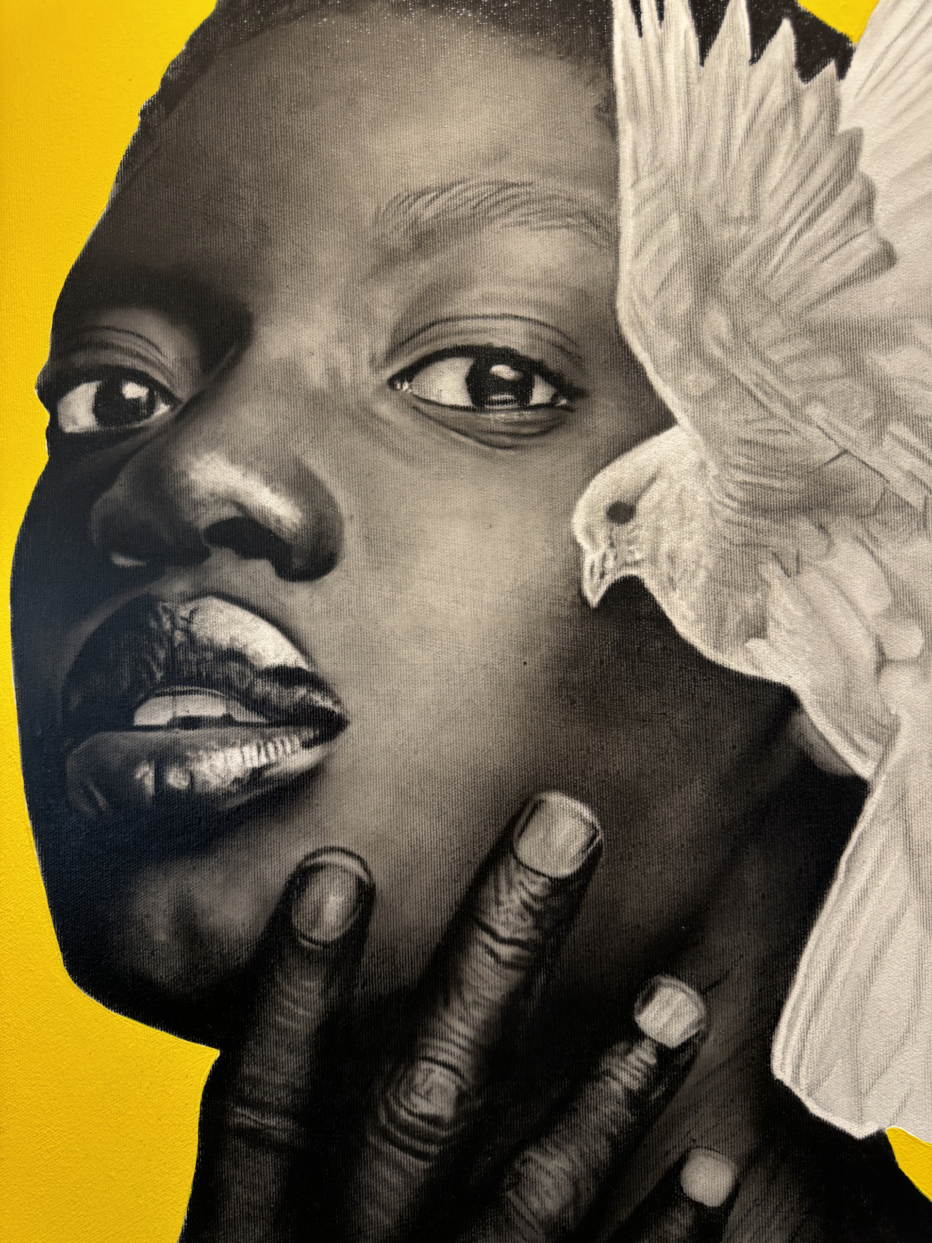 Da sua face e do toque da própria mão, emerge o voo de uma pomba branca, metáfora da fragilidade humana, mas também da transcendência e da esperança. A justaposição entre o realismo do corpo e a abstração cromática do fundo transforma a cena num espaço suspenso, onde o silêncio se torna linguagem e a intimidade se revela como força.